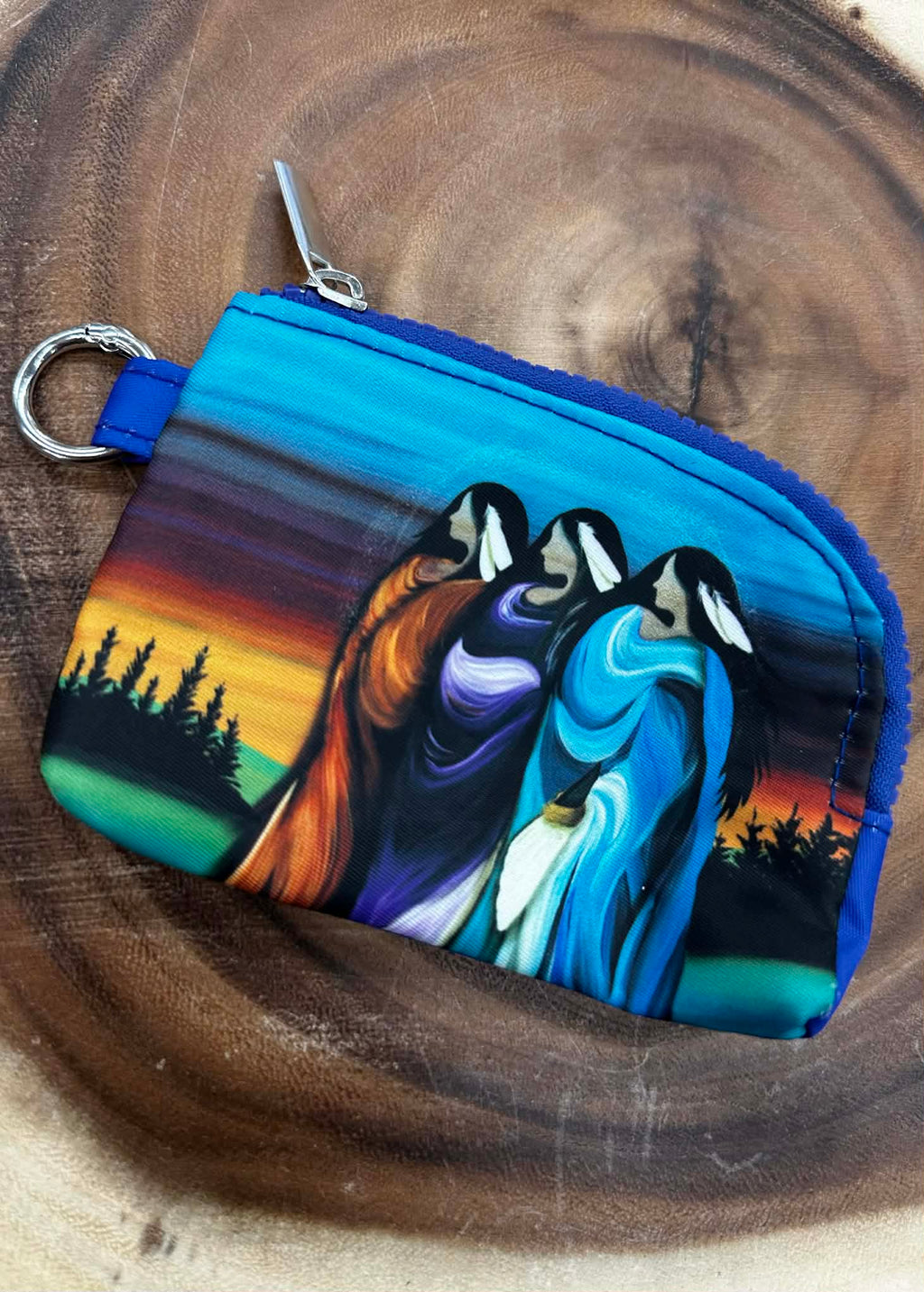 Our Pocket Wallets feature vibrant authentic indigenous art printed on durable, water-resistant polyester. The zippered main compartment keeps small essentials secure, while interior card slots help you stay organized on the go. An attached keychain ring lets you clip the wallet to keys, bags, or a lanyard for easy access